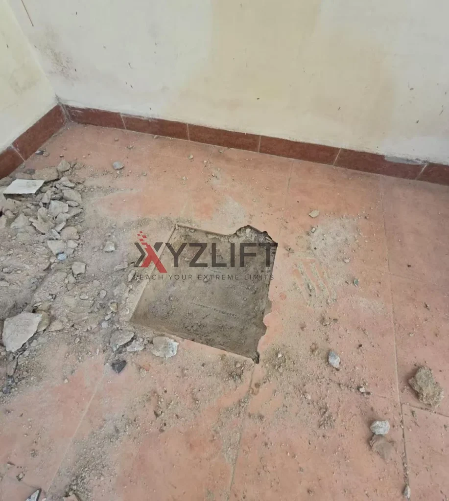 Regarding the foundation pit issue, the client wants our elevator platform to be flush with the ground, thus requiring a foundation pit for installation. Our standard recommended pit depth is 150mm, which includes a safety buffer distance. However, the client’s flooring is already installed, necessitating demolition and the excavation of a pit. Therefore, they prefer a smaller pit. Our elevators have a safety touch panel at the bottom, which automatically stops upon detecting a collision. This is a crucial safety feature and cannot be removed. Therefore, while retaining the safety touch panel, we have specified a minimum pit depth of 120mm.