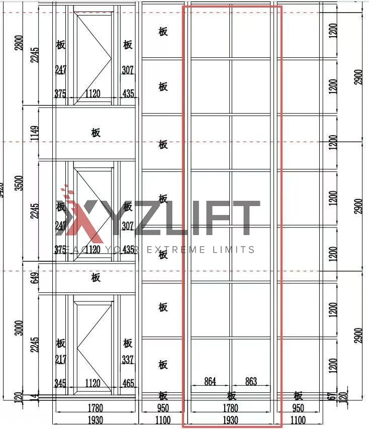 The client is installing the elevator in the middle of the staircase, with an installation space of 1930mm. However, the elevator itself is only 1690mm wide, leaving a 240mm gap that is extremely dangerous. Therefore, our solution is to make the shaft width 1930mm. Due to the size limitations of hydraulic elevators, 1690mm is the maximum internal installation size. This means there will be some empty space within the shaft, but the entire shaft is enclosed, ensuring complete safety for the installation in the middle of the staircase.