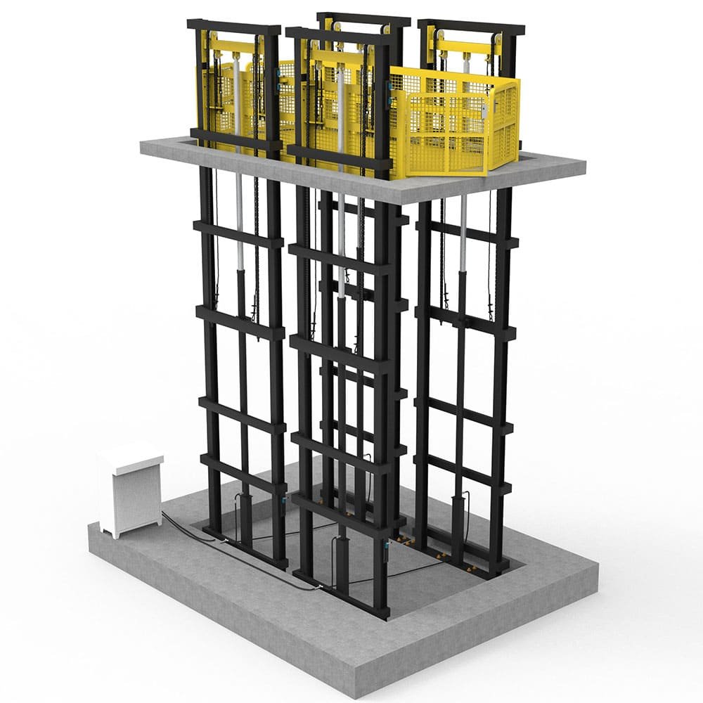 - Pump station with case cover: The pump station of the goods lift is enclosed with a protective case cover, offering protection against adverse weather conditions and external forces.