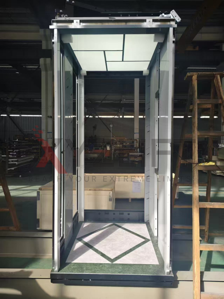 Due to limited installation space, we maximized the cabin size to accommodate wheelchairs. Therefore, we opted for a manual landing door. Manual landing doors are suitable for limited shaft space, increasing the opening width without encroaching on internal shaft space.