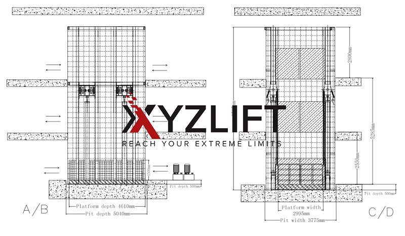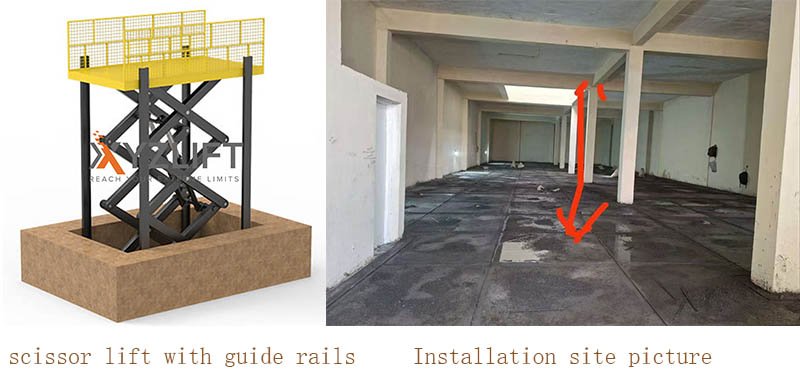 A3: Based on the floor opening dimensions provided by the client, we precisely calculated the adapted platform size for the guided lifts, which the client confirmed. For the fixed scissor lift installed through the floor opening, we recommended adding 4 guide rails to significantly reduce operational shaking and ensure smooth passage through the floor openings.