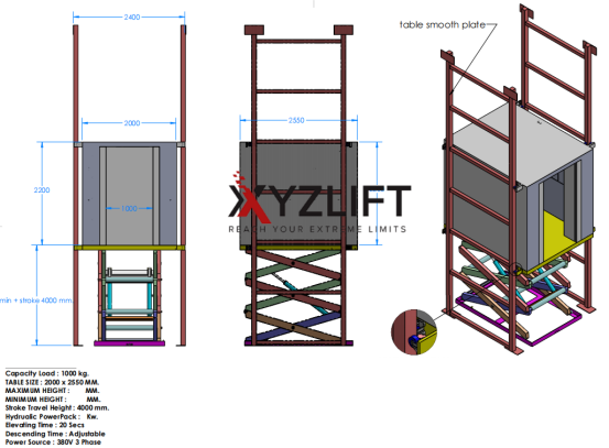 Initially, the client’s proposal was a scissor lift structure combined with a car. This structure can meet the dimensional requirements, yet it has numerous drawbacks during operation: