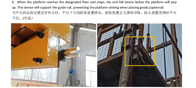 4. Since this lift is used for vehicles and has a large platform, slight sinking may occur after reaching the designated floor. Therefore, we recommended the customer to add an anti-fall device. Once the platform reaches the designated floor, the anti-fall device underneath will engage with the guide rails to prevent platform sinking.